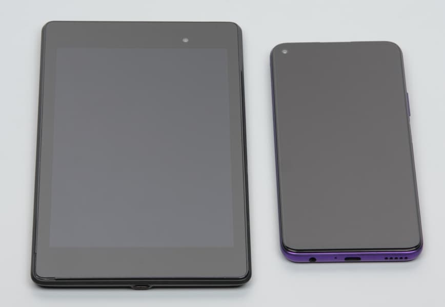 Лицевая поверхность экрана выполнена в виде стеклянной пластины с зеркально-гладкой поверхностью, устойчивой к появлению царапин. Судя по отражению объектов, антибликовые свойства экрана лучше, чем у экрана Google Nexus 7 (2013) (далее просто Nexus 7). Для наглядности приведем фотографию, на которой в выключенных экранах отражается белая поверхность (слева — Nexus 7, справа — Honor 30S, далее их можно различать по размеру):