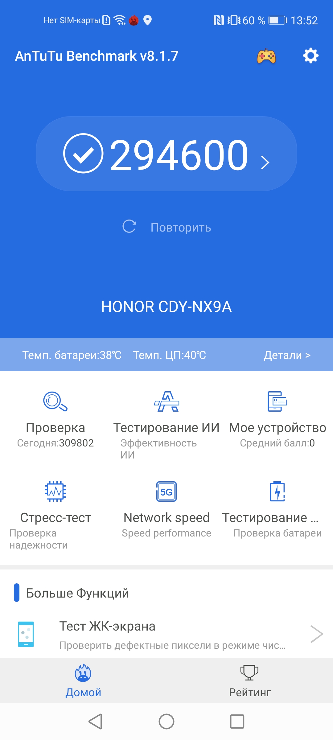 | AnTuTu (v8.x) (больше — лучше) | 294600 | 272020 | 315595 | 339871 | 256769 |