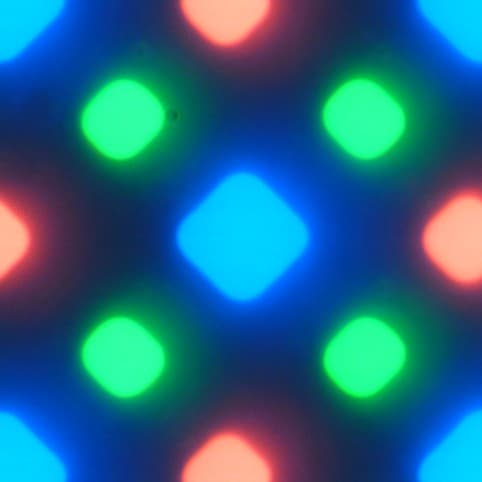 В этом экране используется матрица AMOLED — активная матрица на органических светодиодах. Полноцветное изображение создается с помощью субпикселей трех цветов — красного (R), зеленого (G) и синего (B), но красных и синих субпикселей в два раза меньше, что можно обозначить как RGBG. Это подтверждается фрагментом микрофотографии: