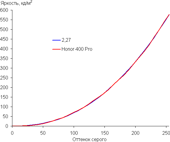 Построенная по 32 точкам с равным интервалом по численному значению оттенка серого гамма-кривая показала, что существенного завала нет ни в светах, ни в тенях. Показатель аппроксимирующей степенной функции равен 2,27, что немного выше стандартного значения 2,2, при этом реальная гамма-кривая мало отклоняется от степенной зависимости: