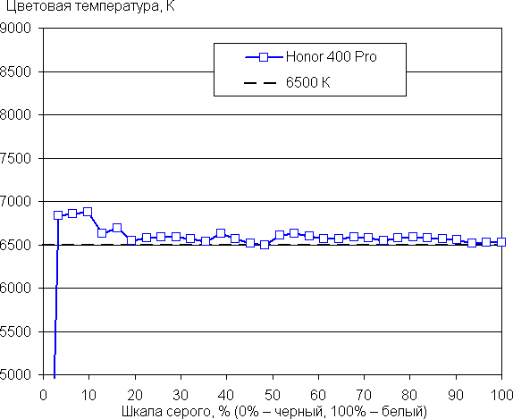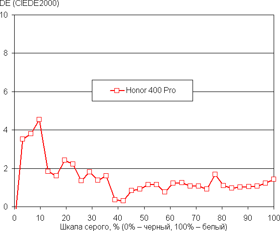 Напомним, что в случае OLED-экранов яркость фрагментов изображения динамично меняется в соответствии с характером выводимого изображения — чуть уменьшается для светлых в целом изображений. В итоге полученная зависимость яркости от оттенка (гамма-кривая), скорее всего, не соответствует гамма-кривой статичного изображения, так как измерения проводились при последовательном выводе оттенков серого почти на весь экран.