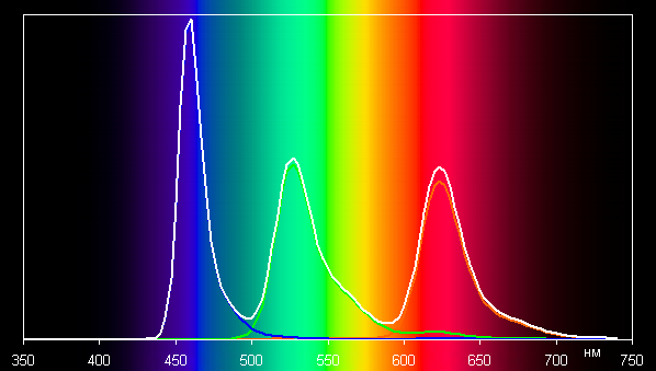 В первом случае спектры компонент (то есть спектры чистых красного, зеленого и синего цветов) очень хорошо разделены: