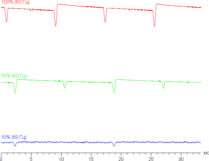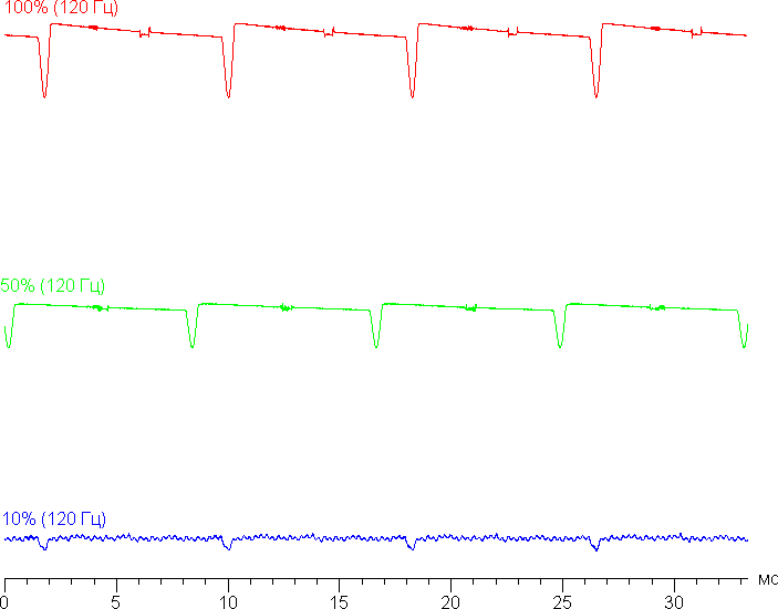 Видно, что на высокой и средней яркости частота невысокая (120 Гц), но и скважность модуляции низкая, в итоге видимого мерцания нет. При сильном понижении яркости появляется дополнительная модуляция с высокой частотой (3,84 кГц), поэтому видимое мерцание всё так же отсутствует.