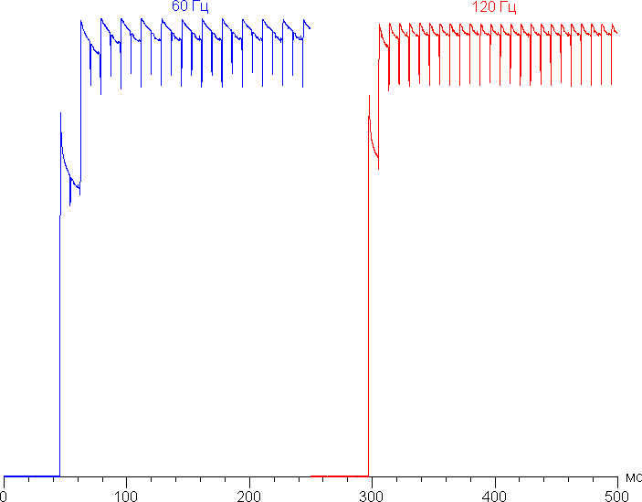 Переключение состояния элементов матрицы выполняется практически мгновенно, но на фронте включения может присутствовать ступенька шириной примерно 17 мс (что соответствует частоте обновления экрана примерно в 60 Гц) или примерно 8 мс (120 Гц). Например, так выглядит зависимость яркости от времени при переходе от черного к белому:
