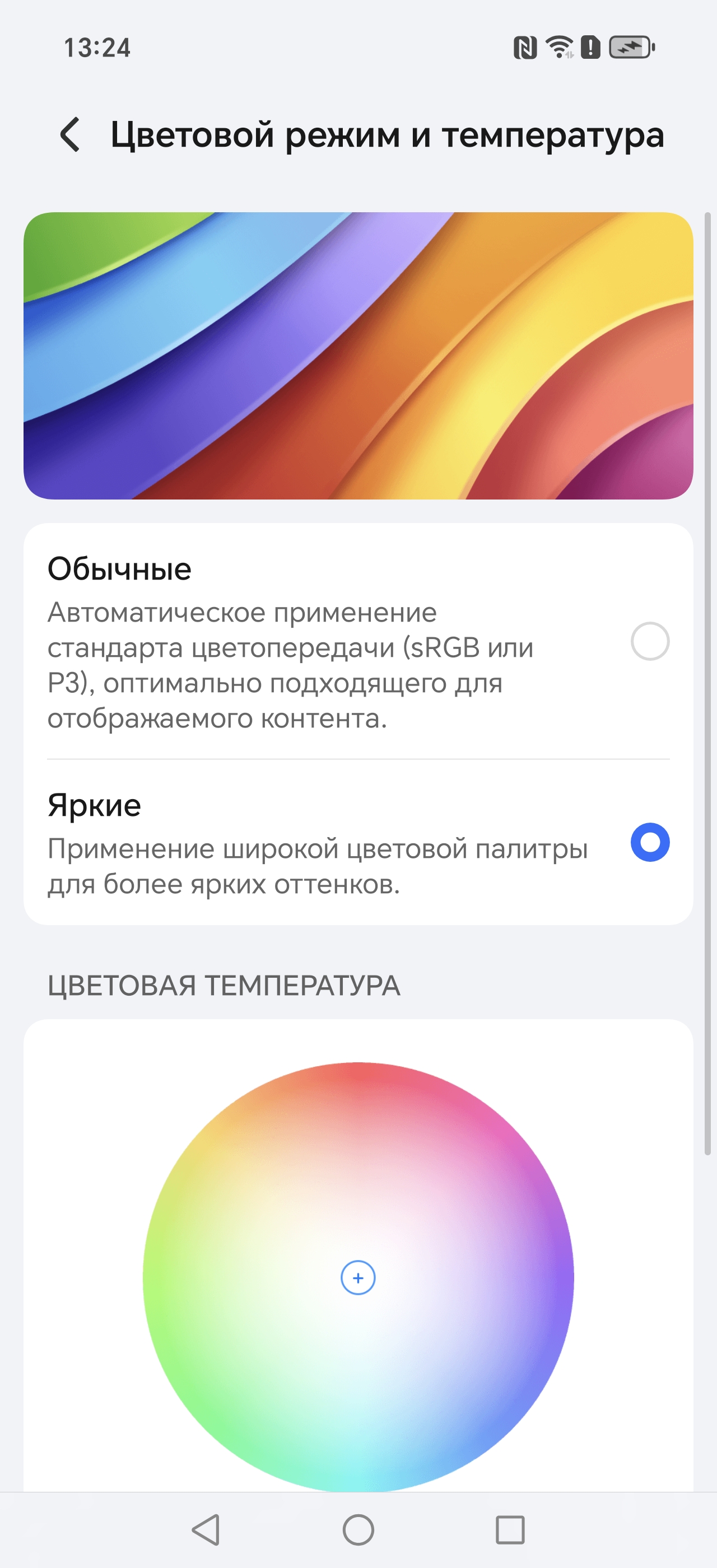 Цветовой охват зависит от выбранного профиля (Яркие или Обычные), от прописанного профиля в самом изображении, также от программы, которая выводит изображение на экран смартфона. В профиле Яркие охват немного уширен относительно прописанного в изображении, тогда как в профиле Обычные охват по возможности соответствует прописанному в изображении. Если профиля в изображении нет, то считается, что оно соответствует sRGB. ПО, которое выводит изображение на экран, должно иметь информацию о возможностях экрана. К примеру Google Chrome поддерживает профили в изображении, но считает, что экран sRGB. Тогда как штатная программа Галерея знает о возможностях экрана.