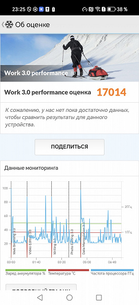 Платформа очень мощная, топового уровня, выполнена по техпроцессу 4 нм. Она набирает в тесте AnTuTu более 1,8 млн баллов, что гораздо выше средного, но немного меньше флагманского уровня. На практике производительности, естественно, с лихвой хватает и для плавной работы интерфейса, и для съемки видео в 4К@60 fps, и для виртуальных развлечений любой сложности. Все игры работают без притормаживаний на высоких настройках. Производительность у этого смартфона — как у истинного субфлагмана, и мощи ему хватит надолго. Кстати, производителем обещана долгая поддержка: гарантируется два обновления мажорных версий Android и три года поддержки дополнительных пакетов.
