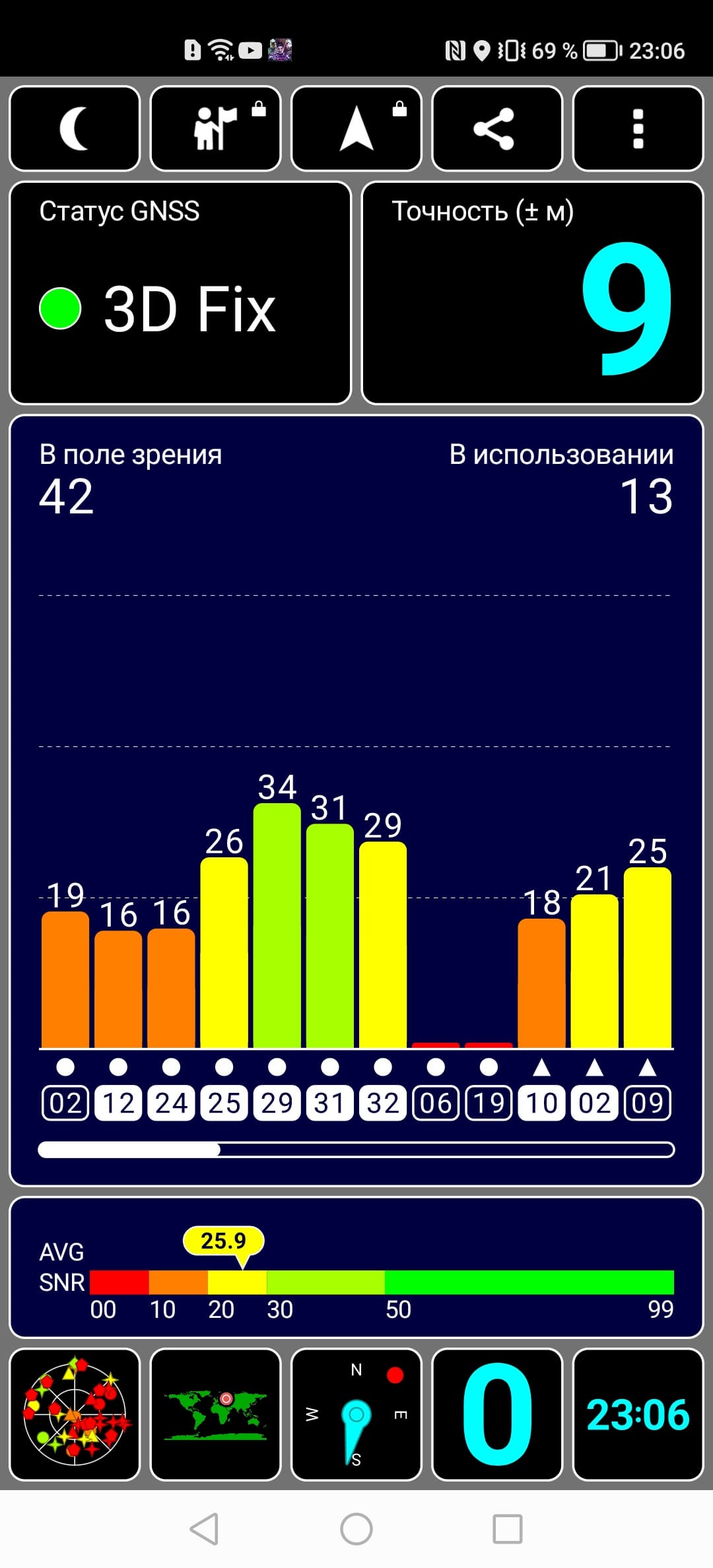 Навигационный модуль работает с GPS (с A-GPS), Глонасс, Galileo, BDS. Первые спутники при холодном старте обнаруживаются быстро, точность позиционирования на среднем уровне.