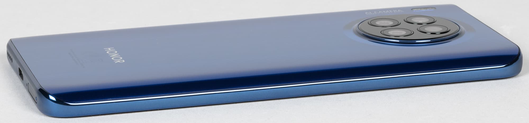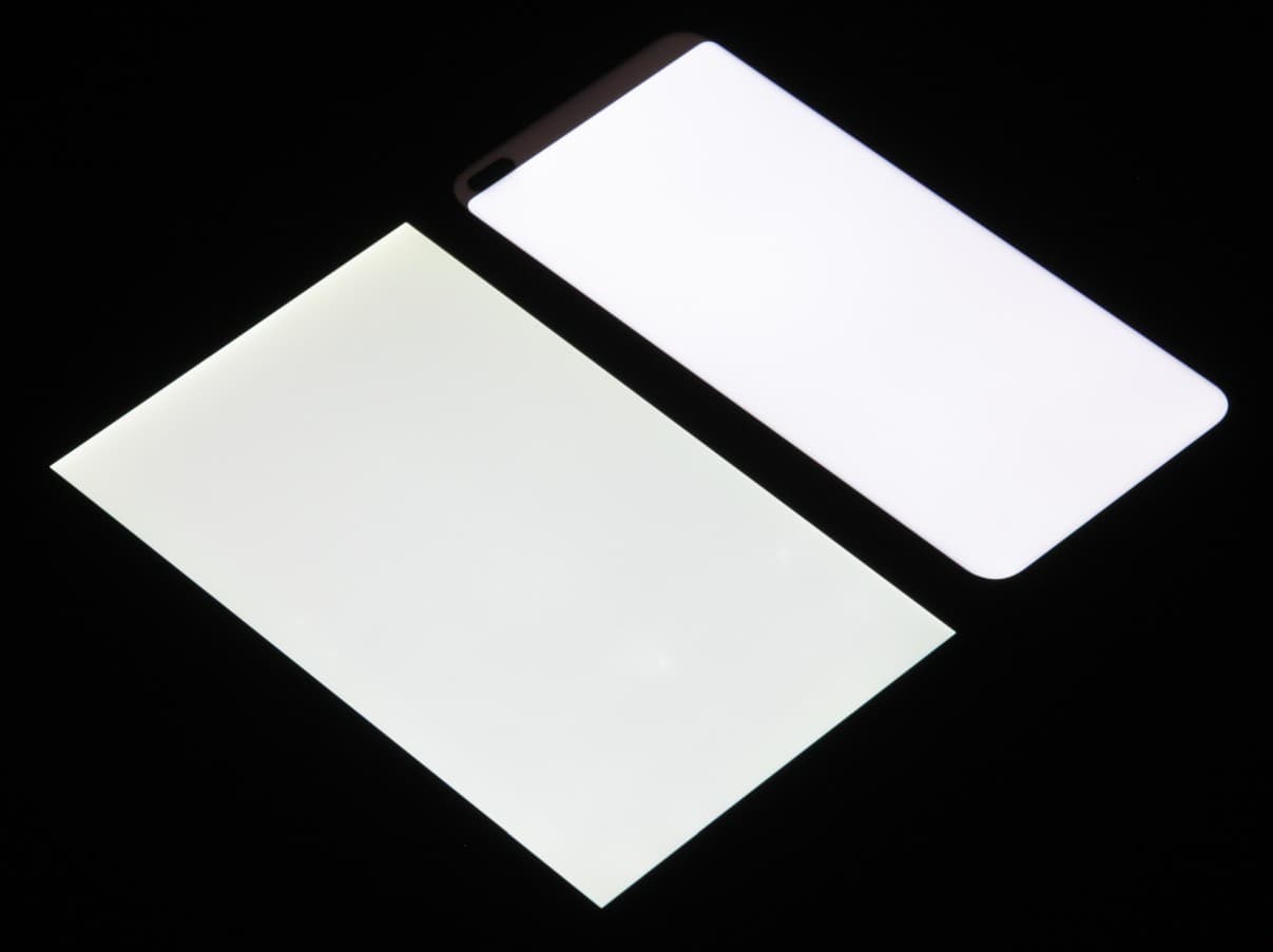 Лицевая поверхность экрана выполнена в виде стеклянной пластины с зеркально-гладкой поверхностью, устойчивой к появлению царапин. Судя по отражению объектов, антибликовые свойства экрана лучше, чем у экрана Google Nexus 7 (2013) (далее просто Nexus 7). Для наглядности приведем фотографию, на которой в выключенных экранах отражается белая поверхность (слева — Nexus 7, справа — Honor 50 Lite, далее их можно различать по размеру):