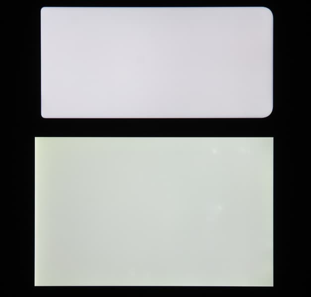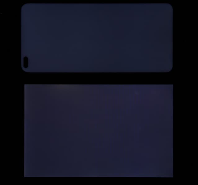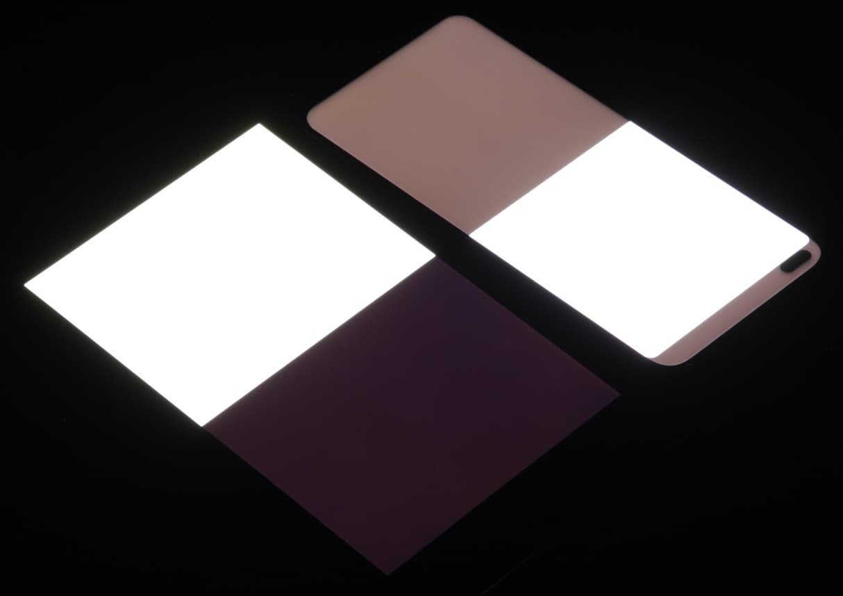 Яркость под углом у экранов уменьшилась (как минимум в 4 раза, исходя из разницы в выдержке), но у смартфона яркость под этим углом все же выше. Черное поле при отклонении по диагонали высветляется сильно, но остается условно нейтрально-серым (так видно глазами). Фотографии ниже это демонстрируют (яркость белых участков в перпендикулярном плоскости экранов направлении одинаковая!):