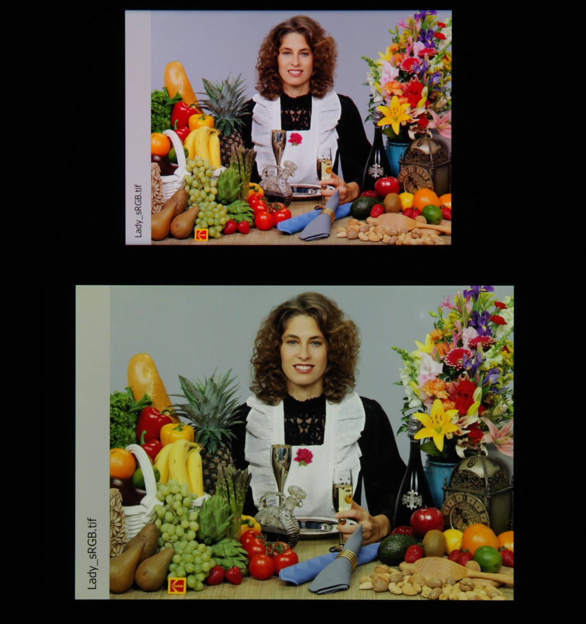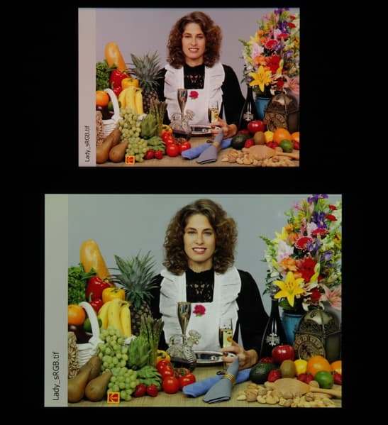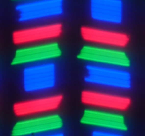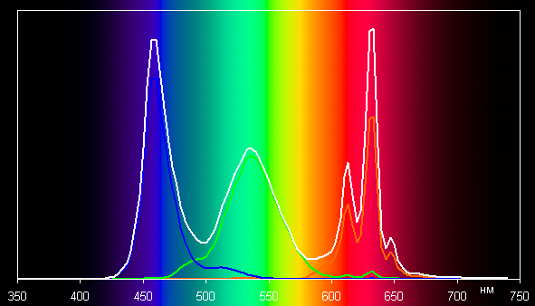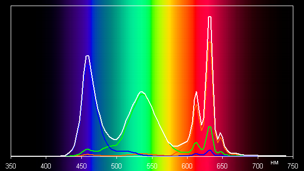 Спектры компонент достаточно хорошо разделены, что и обуславливает широкий цветовой охват. Для потребительского устройства широкий цветовой охват является недостатком, поскольку в итоге цвета изображений — рисунков, фотографий и фильмов, — ориентированных на пространство sRGB (а таких подавляющее большинство), имеют неестественную насыщенность. Особенно это заметно на узнаваемых оттенках, например на оттенках кожи. Результат приведен на фотографиях выше.
