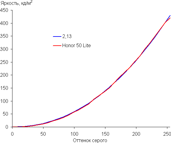 Контрастность (примерно в центре экрана) высокая — порядка 1200:1. Время отклика при переходе черный-белый-черный равно 14 мс (7 мс вкл. + 7 мс выкл.). Переход между полутонами серого 25% и 75% (по численному значению цвета) и обратно в сумме занимает 22 мс. Построенная по 32 точкам с равным интервалом по численному значению оттенка серого гамма-кривая не выявила завала ни в светах, ни в тенях. Показатель аппроксимирующей степенной функции равен 2,13, что немного ниже стандартного значения 2,2. При этом реальная гамма-кривая слегка отклоняется от степенной зависимости: