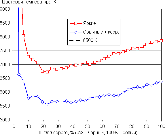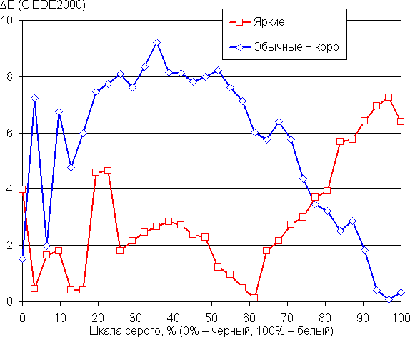 На графиках ниже кривые Яркие соответствуют результатам без какой-либо коррекции цветового баланса (профиль Яркие), а кривые Обычные + корр. — данным, полученным после выбора профиля Обычные и ручной коррекции цветового баланса (точка на круге коррекции — как на снимке выше). (Самые темные области шкалы серого можно не учитывать, так как там баланс цветов не имеет большого значения, да и погрешность измерений цветовых характеристик на низкой яркости большая.)