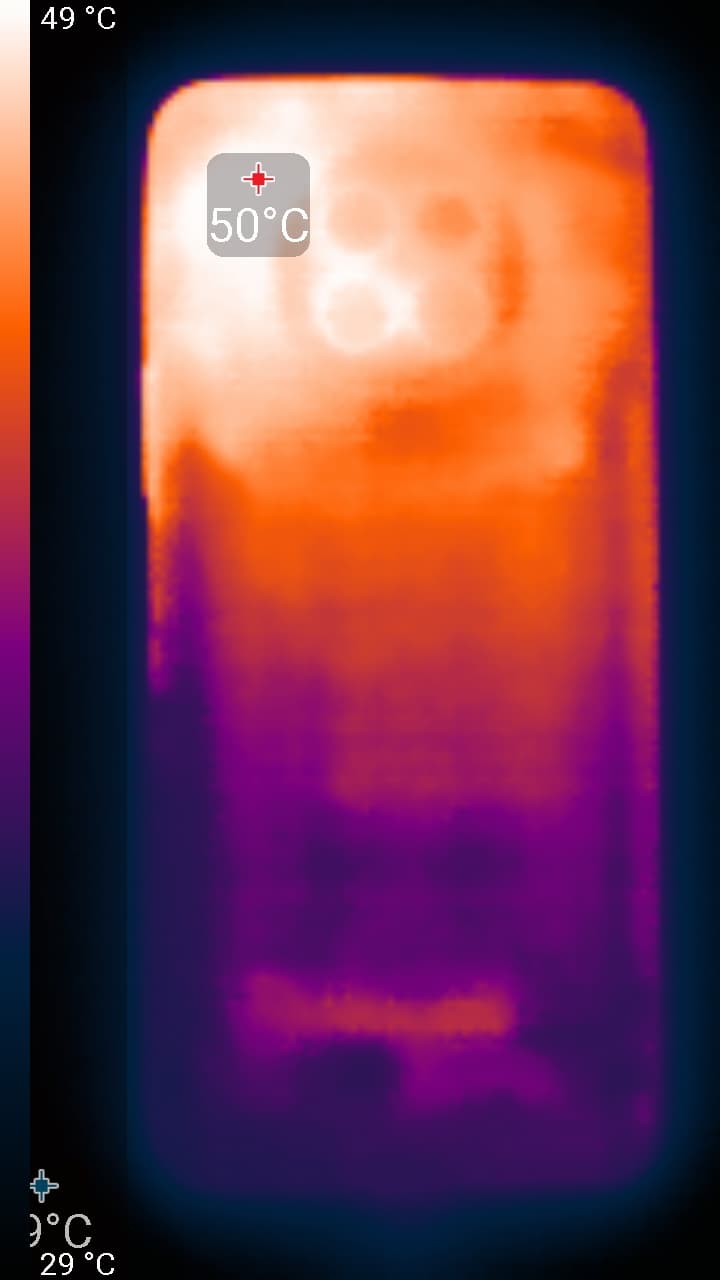 Нагрев больше в верхней части аппарата, что, видимо, соответствует расположению микросхемы SoC. По данным теплокамеры, максимальный нагрев составил аж 50 градусов (при температуре окружающего воздуха в 24 градуса), это рекордно высокий нагрев в случае данного теста в сравнении с другими современными смартфонами.