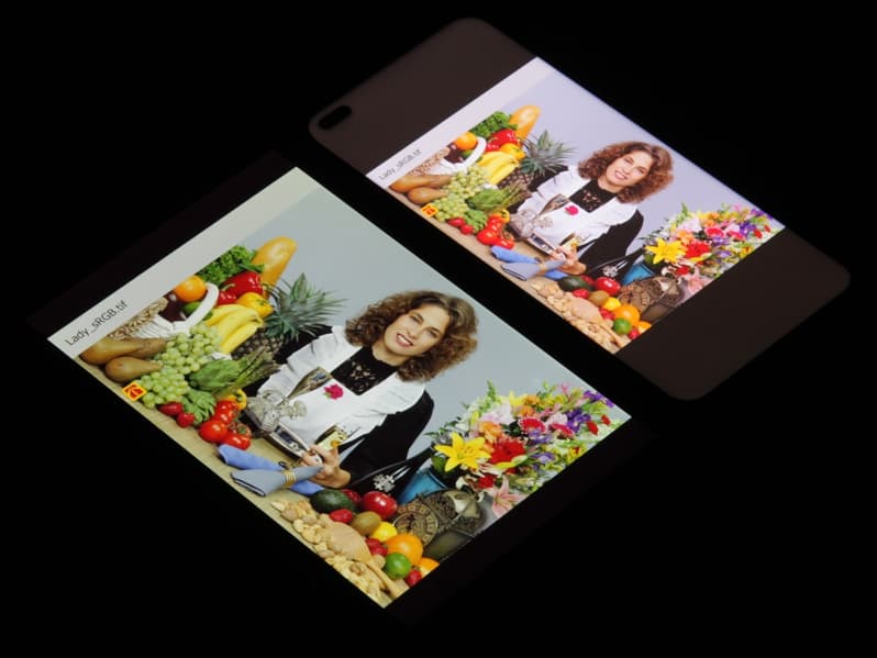 Экран имеет хорошие углы обзора без значительного сдвига цветов даже при больших отклонениях взгляда от перпендикуляра к экрану и без инвертирования оттенков. Для сравнения приведем фотографии, на которых на экраны Honor 50 Lite и Nexus 7 выведены одинаковые изображения, при этом яркость экранов изначально установлена примерно на 200 кд/м², а цветовой баланс на фотоаппарате принудительно переключен на 6500 К.