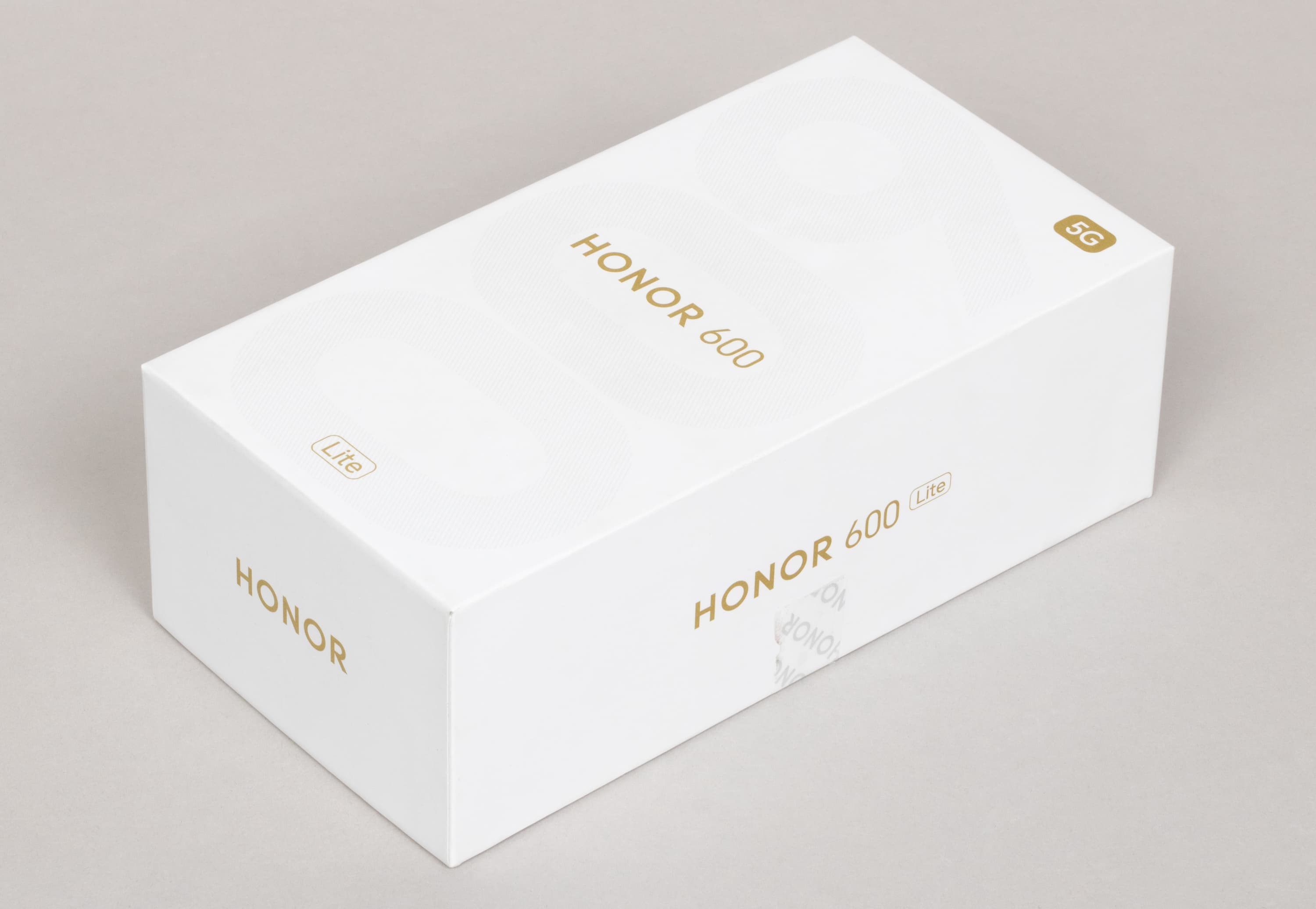 Смартфон Honor 600 Lite поставляется в стандартной формы картонной коробке с лаконичным оформлением.