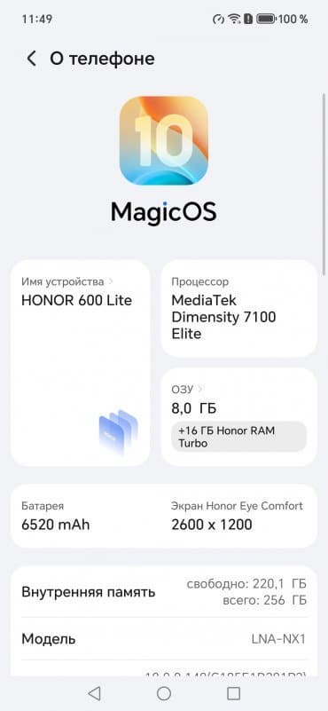 Смартфон Honor 600 Lite работает на восьмиядерной SoC Mediatek Dimensity 7100 Elite, которая производится по нормам 6-нанометрового техпроцесса. Это платформа далеко не топовая, примерно нижне-среднего уровня, с ней смартфон набирает в AnTuTu 11 менее 700 тысяч баллов (флагманы набирают в этой версии теста уже под 4 млн). Производительность не очень высокая, ее достаточно для выполнения большинства стандартных организационных задач, но видеосъемка в 4К и/или с 60 fps недоступна, а в требовательных играх придется понижать уровень графики.