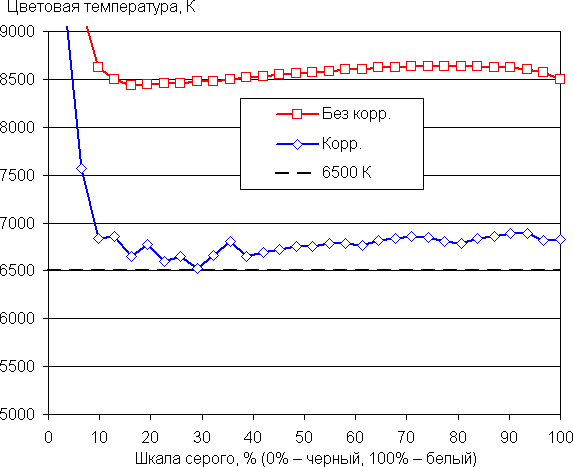 В итоге визуально цвета на этом экране не отличались бы от естественных, но результат портит небольшое завышение цветового контраста. Баланс оттенков на шкале серого компромиссный, так как цветовая температура существенно выше стандартных 6500 К, но отклонение от спектра абсолютно черного тела (ΔE) ниже 10, что для потребительского устройства считается приемлемым показателем. При этом цветовая температура и ΔE мало изменяются от оттенка к оттенку — это положительно сказывается на визуальной оценке цветового баланса. (Самые темные области шкалы серого можно не учитывать, так как там баланс цветов не имеет большого значения, да и погрешность измерений цветовых характеристик на низкой яркости большая.)