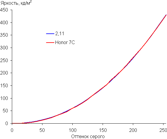 Контрастность (примерно в центре экрана) высокая — порядка 1600:1. Время отклика при переходе черный-белый-черный равно 24 мс (14 мс вкл. + 10 мс выкл.). Переход между полутонами серого 25% и 75% (по численному значению цвета) и обратно в сумме занимает 43 мс. Построенная по 32 точкам с равным интервалом по численному значению оттенка серого гамма-кривая не выявила завала ни в светах, ни в тенях. Показатель аппроксимирующей степенной функции равен 2,11, что немного ниже стандартного значения 2,2. При этом реальная гамма-кривая почти не отклоняется от степенной зависимости: