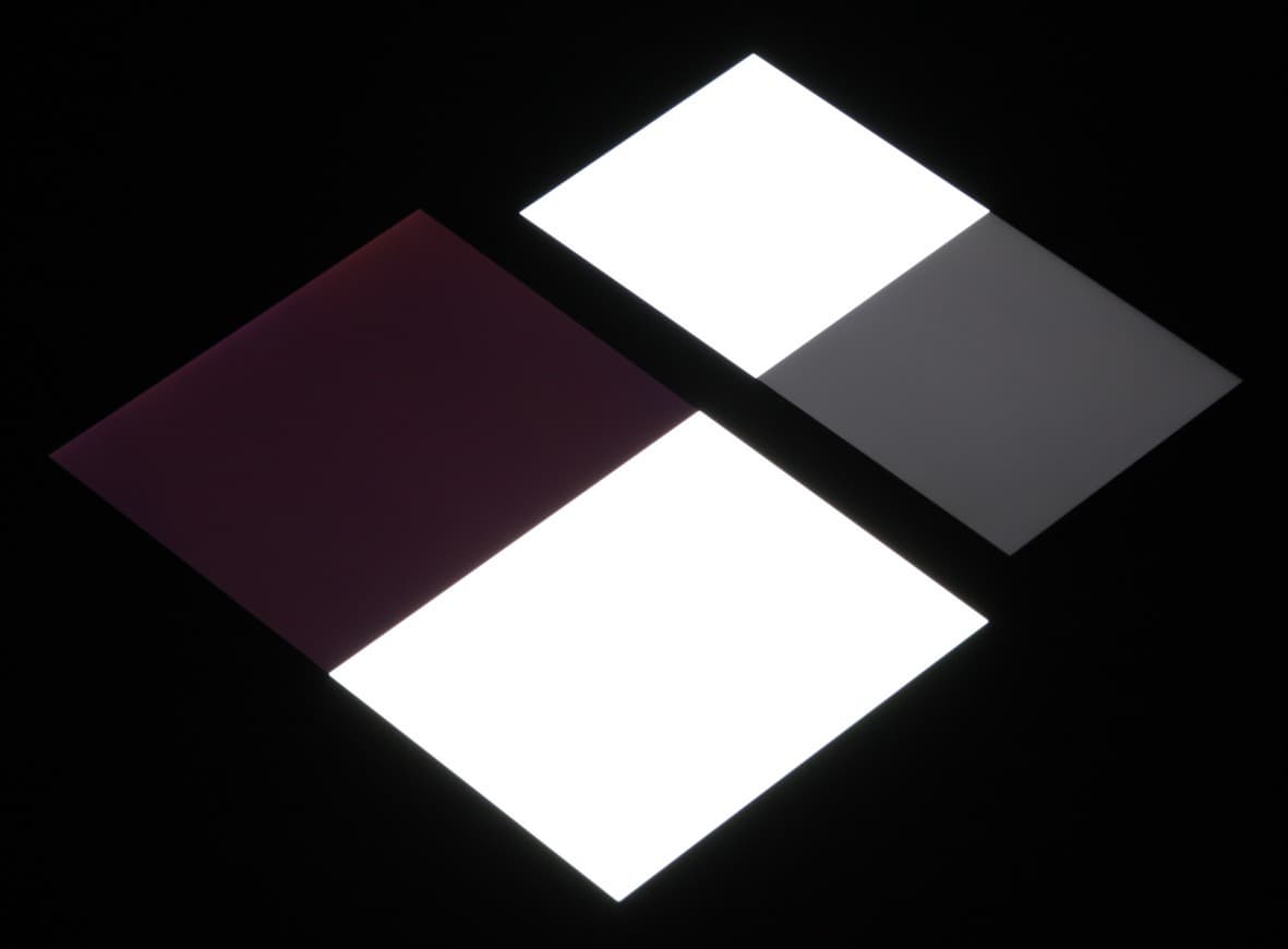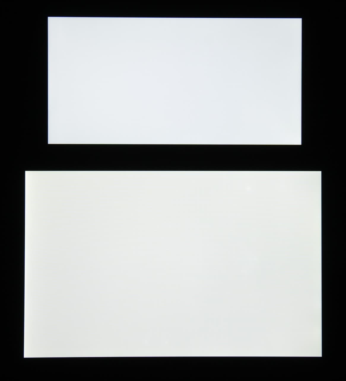 Яркость под углом у экранов уменьшилась (как минимум в 5 раз, исходя из разницы в выдержке), но в случае Honor 7C падение яркости больше. Черное поле при отклонении по диагонали высветляется сильно, но остается условно нейтрально-серым по оттенку. Фотографии ниже это демонстрируют (яркость белых участков в перпендикулярном плоскости экранов направлении одинаковая!):