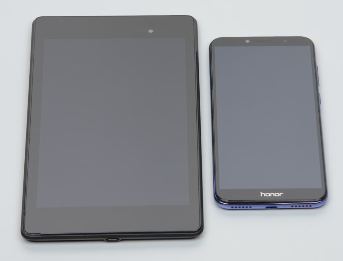 Лицевая поверхность экрана выполнена в виде стеклянной пластины с зеркально-гладкой поверхностью, устойчивой к появлению царапин. Судя по отражению объектов, антибликовые свойства экрана чуть хуже, чем у экрана Google Nexus 7 (2013) (далее просто Nexus 7). Для наглядности приведем фотографию, на которой в выключенных экранах отражается белая поверхность (слева — Nexus 7, справа — Honor 7C, далее их можно различать по размеру):