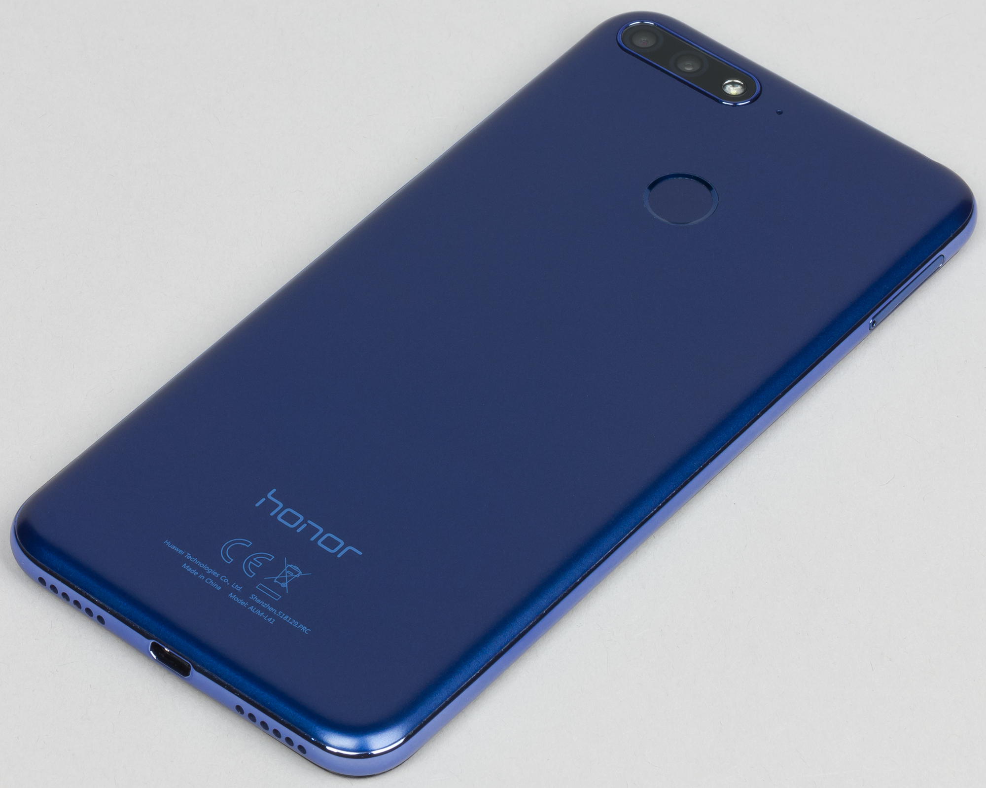 Honor 7C получил пластиковый корпус со стандартным обтекаемым дизайном, как у большинства безликих недорогих смартфонов, без собственной изюминки. Передняя панель прикрыта 2.5D-стеклом с покатыми краями.