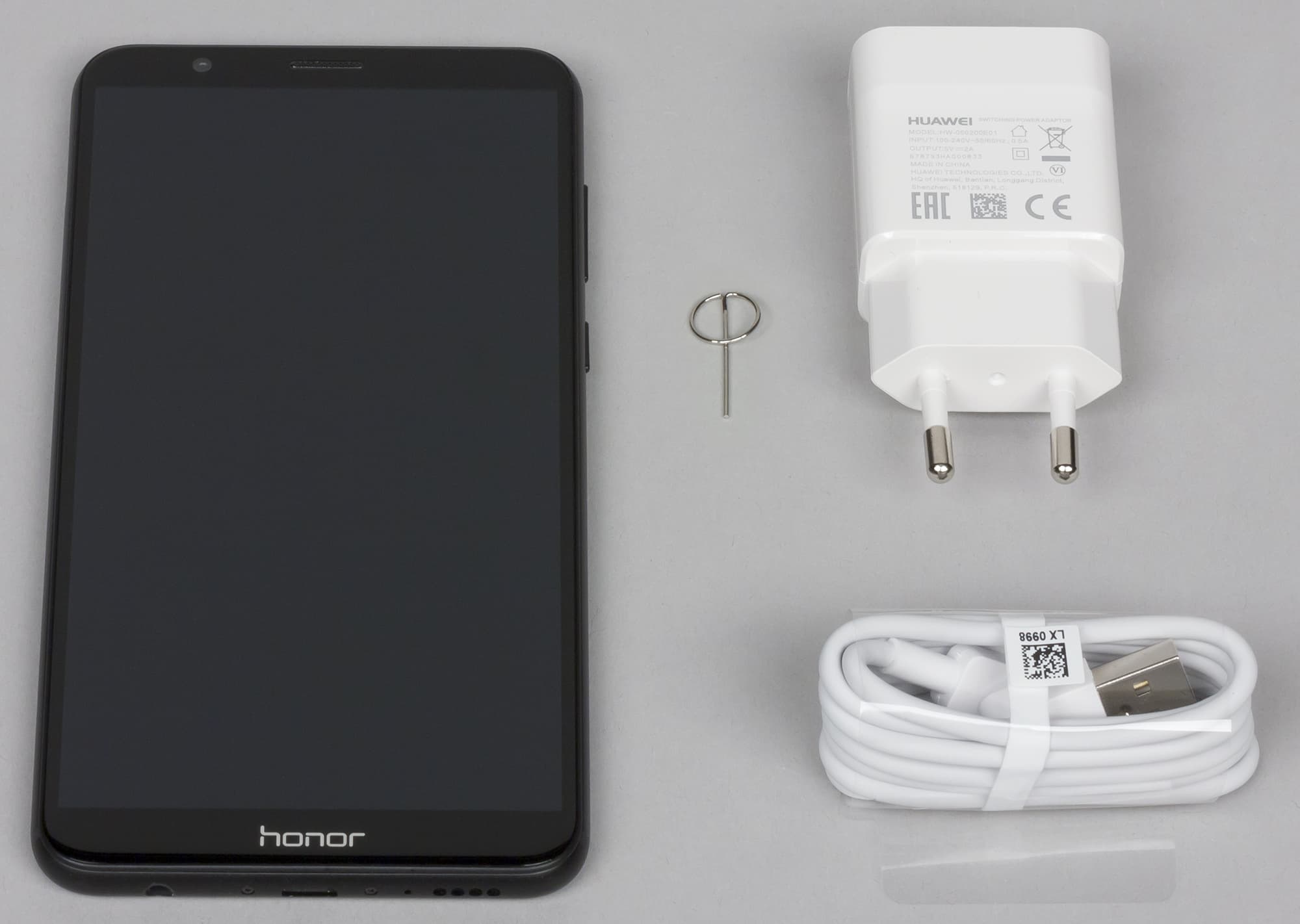 В комплект нашего тестового аппарата входили стандартное зарядное устройство без поддержки быстрой зарядки (5 В 2 А), USB-кабель и инструмент для извлечения карт.