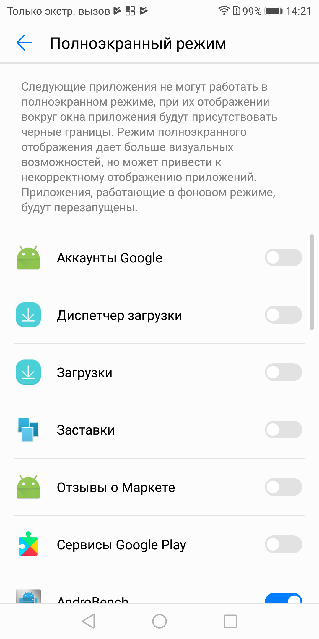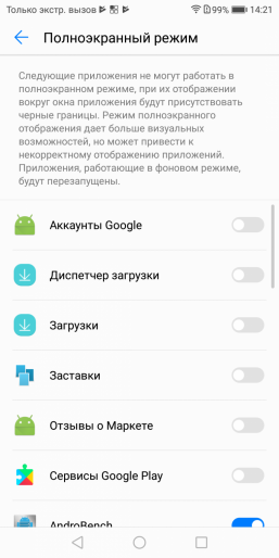Что касается так называемого «полноэкранного режима», который появился благодаря изменившемуся соотношению сторон и, соответственно, дополнительному месту на экране, то оно по умолчанию не занято, зияет черными полосами. Есть возможность войти в настройки и выбрать для каждого из приложений вариант использования «полноэкранного режима», и после перезагрузки приложение будет отображаться уже на весь экран.