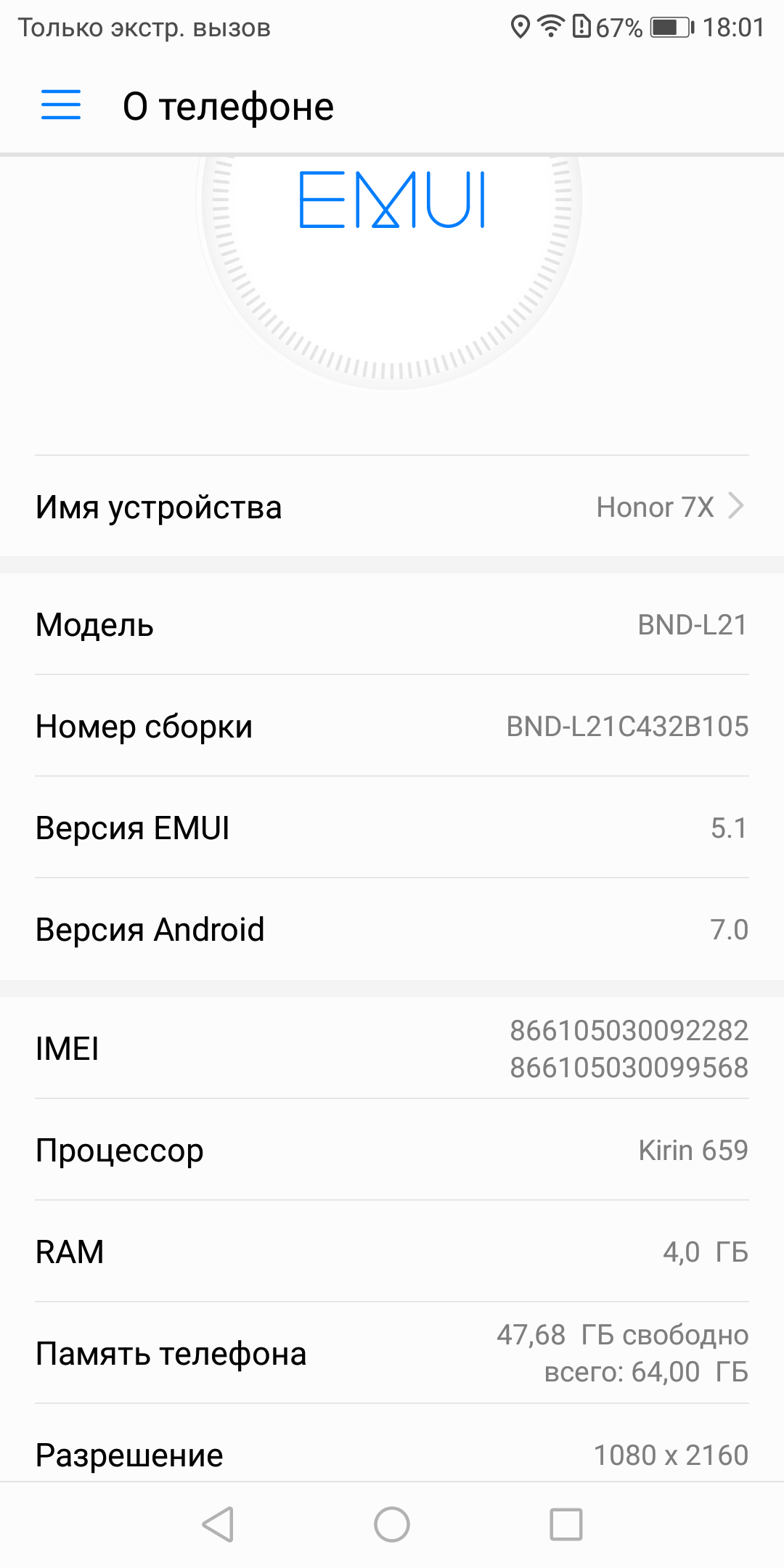 Основные характеристики Honor 7X (модель BND-L21)