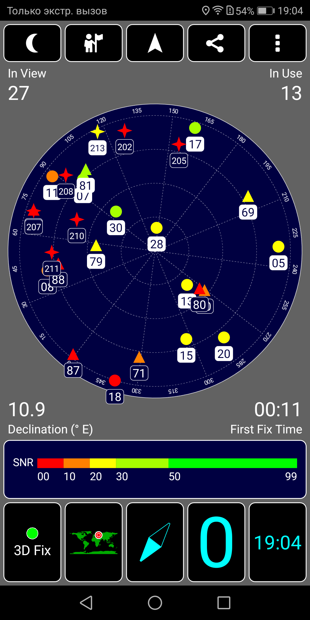 Навигационный модуль работает с GPS (с A-GPS), с отечественной Глонасс и с китайской Beidou. Первые спутники при холодном старте обнаруживаются в течение десятков секунд, точность позиционирования высокая. Имеется встроенный датчик магнитного поля для функционирования компаса.