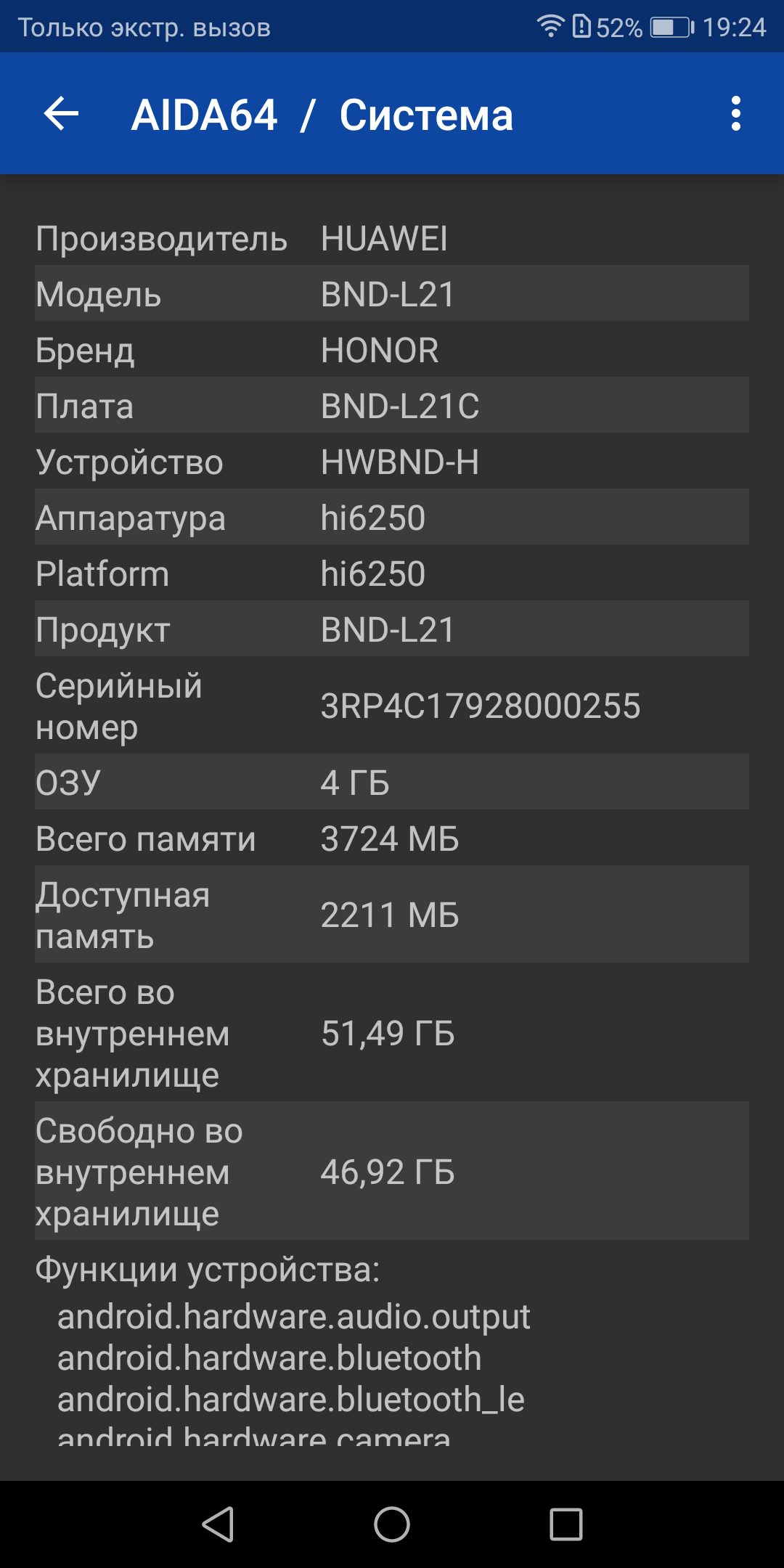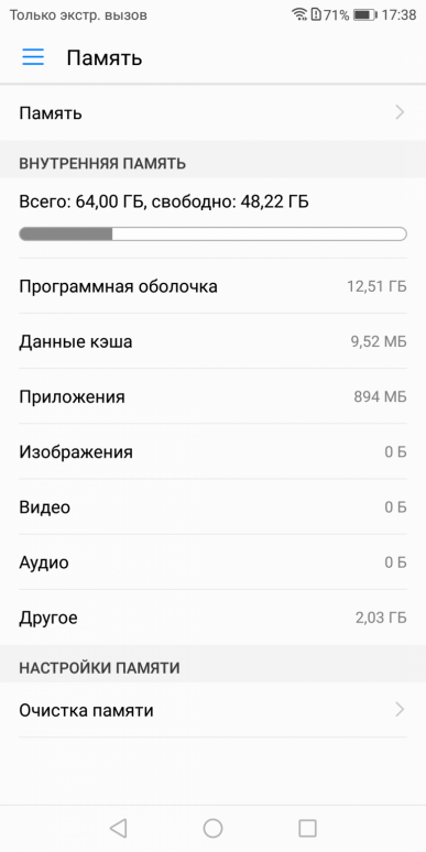 Аппаратная платформа Honor 7X строится на SoC HiSilicon Kirin 659. В конфигурацию чипа входит восемь процессорных ядер ARM Cortex-A53 в двух кластерах с максимальной частотой 2,36 и 1,7 ГГц. SoC выполнена по 16-нанометровому техпроцессу. За обработку графики отвечает видеоускоритель ARM Mali-T830 (MP2) с поддержкой графического API OpenGL ES 3.2. Объем оперативной памяти составляет 4 ГБ, встроенной флэш-памяти в случае нашего экземпляра — 64 ГБ. Из них свободно 2,48 ГБ ОЗУ и всего 48,5 ГБ места на накопителе, обычно бывает более 50 ГБ. Есть модификации Honor 7X с иным объемом встроенной памяти.