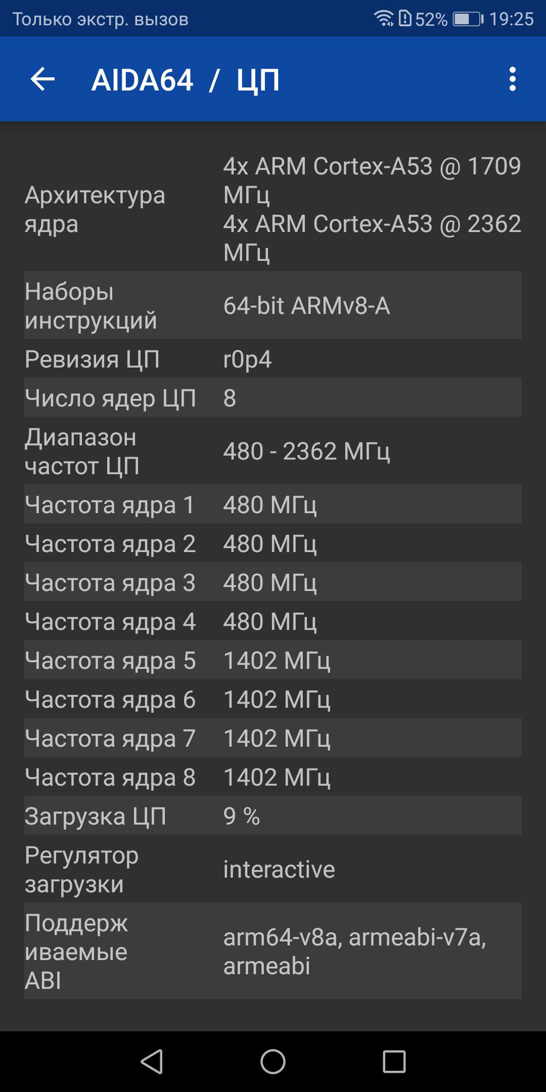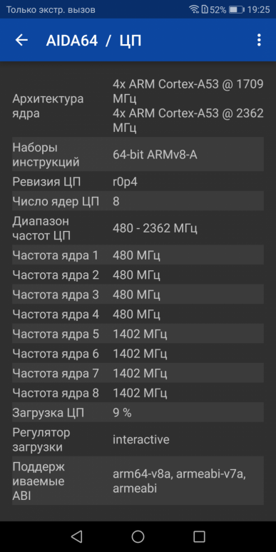 - SoC HiSilicon Kirin 659, 8 ядер Cortex-A53 (4@2,4 ГГц + 4@1,7 ГГц)