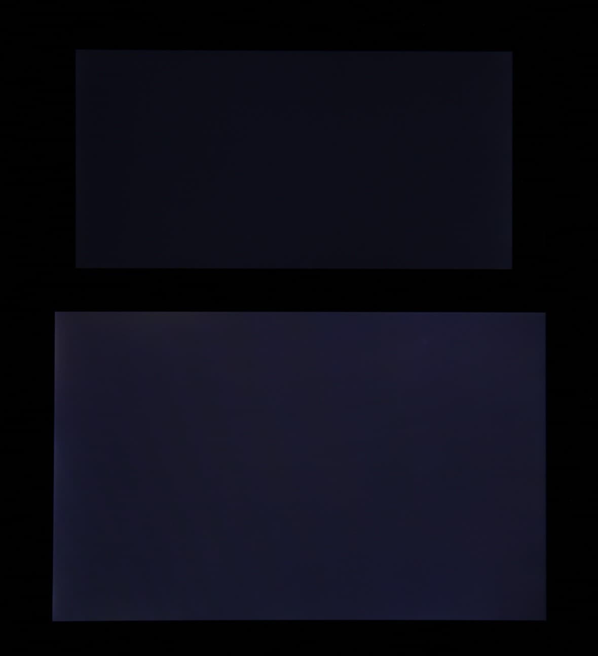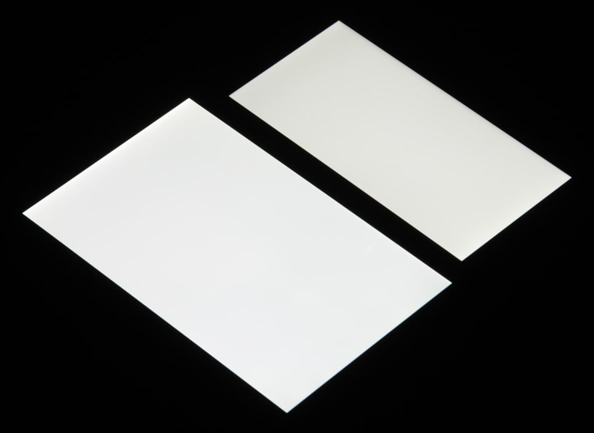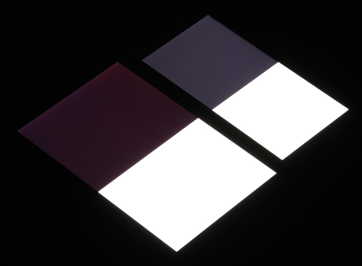 Яркость под углом у экранов уменьшилась (как минимум в 5 раз, исходя из разницы в выдержке), но в случае Honor 7X падение яркости чуть больше. Черное поле при отклонении по диагонали высветляется в средней степени и приобретает фиолетовый оттенок. Фотографии ниже это демонстрируют (яркость белых участков в перпендикулярном плоскости экранов направлении одинаковая!):