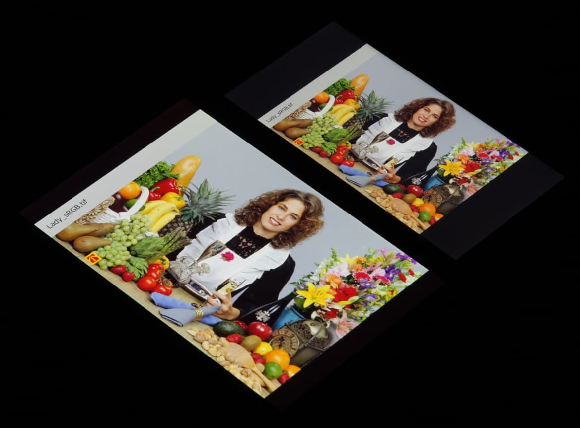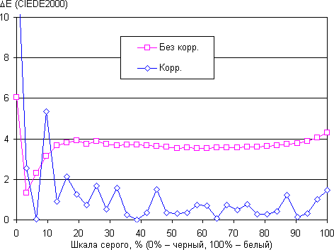 В итоге визуально цвета на этом экране не отличаются от естественных. Баланс оттенков на шкале серого хороший, так как цветовая температура не сильно выше стандартных 6500 К, и отклонение от спектра абсолютно черного тела (ΔE) ниже 10, что для потребительского устройства считается приемлемым показателем. При этом цветовая температура и ΔE мало изменяются от оттенка к оттенку — это положительно сказывается на визуальной оценке цветового баланса. (Самые темные области шкалы серого можно не учитывать, так как там баланс цветов не имеет большого значения, да и погрешность измерений цветовых характеристик на низкой яркости большая.)