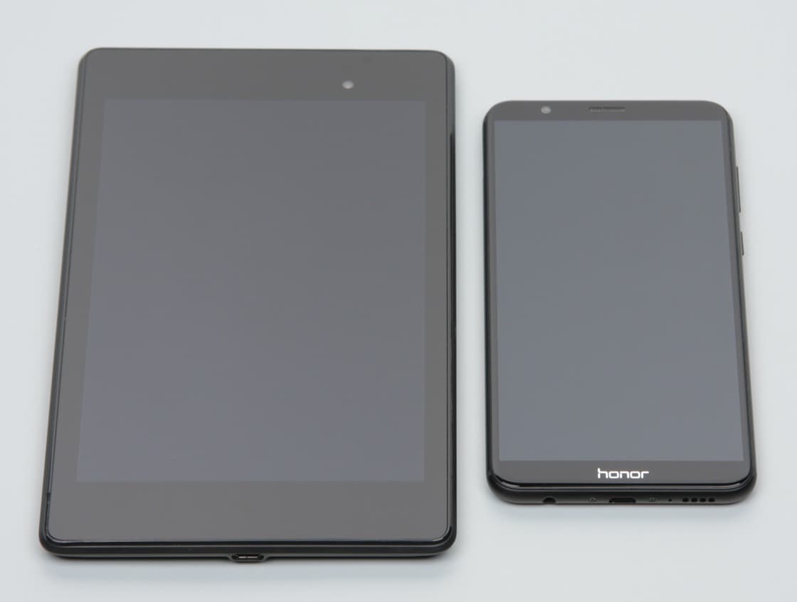 Лицевая поверхность экрана выполнена в виде стеклянной пластины с зеркально-гладкой поверхностью, устойчивой к появлению царапин. Судя по отражению объектов, антибликовые свойства экрана чуть хуже, чем у экрана Google Nexus 7 (2013) (далее просто Nexus 7). Для наглядности приведем фотографию, на которой в выключенных экранах отражается белая поверхность (слева — Nexus 7, справа — Honor 7X, далее их можно различать по размеру):