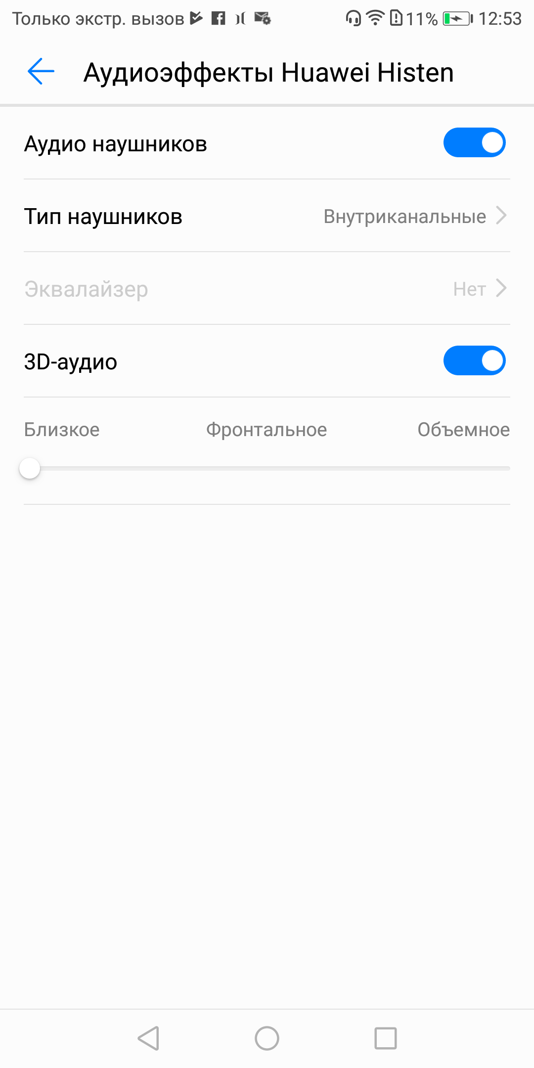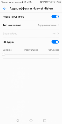 Для прослушивания музыки используется, как обычно, собственный аудиоплеер со знакомым интерфейсом. Раньше у него не было вообще никаких ручных настроек, а в новых версиях появился раздел аудиоэффектов Huawei Histen, в котором можно включать эффект 3D-звука и выбирать из пресетов эквалайзера — но все это становится доступно только с подключенными наушниками. В любом случае, и в наушниках, и через динамик смартфон звучит вполне удовлетворительно, ничего особенного в звуковом плане Honor 7X не предлагает, но и некачественным звук не назовешь.