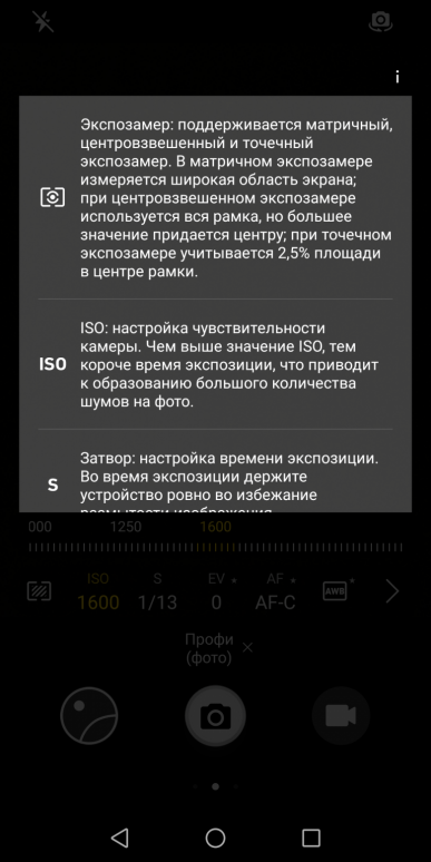 Здесь нет интеллектуальной технологии распознавания сцен, как в старших моделях, но все остальное присутствует, в том числе режим «широкой диафрагмы» для размытия фона. Естественно, имеется и режим ручных настроек Pro. В ручном режиме работает настройка баланса белого, фокусировки, светочувствительности, экспокоррекции.
