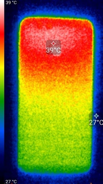 Видно, что нагрев больше локализован в верхней части аппарата, что, видимо, соответствует расположению микросхемы SoC. По данным теплокамеры, максимальный нагрев составил 39 градусов (при температуре окружающего воздуха в 24 градуса), это не очень много.