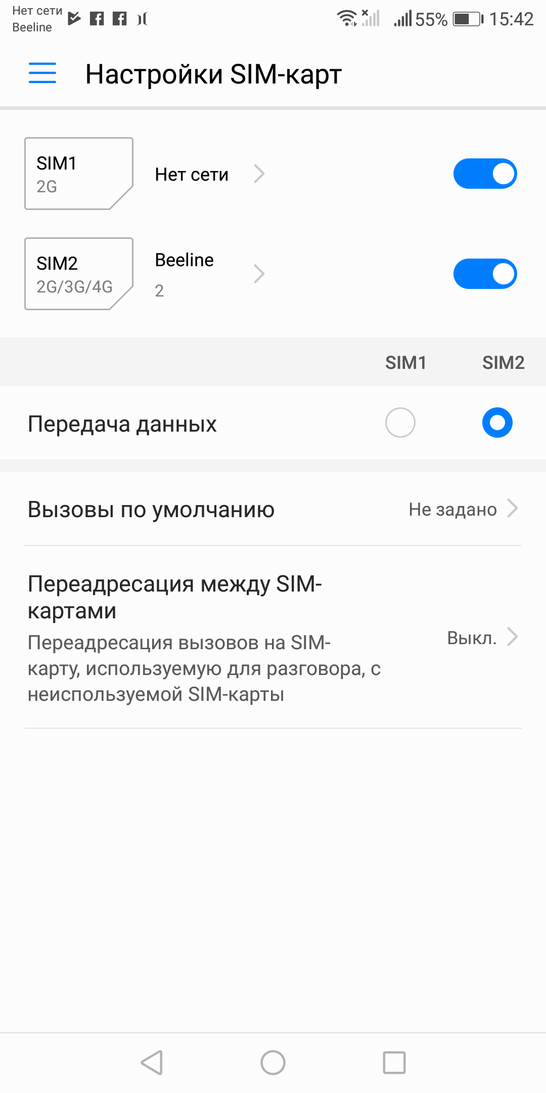 Смартфон не умеет поддерживать в режиме активного ожидания обе SIM-карты в 4G одновременно. Здесь одна SIM-карта (не та, что выбрана для передачи данных в 4G) всегда будет работать в ожидании лишь в 2G. Интерфейс не позволяет выбрать для отправки SMS определенную SIM-карту заранее — только для голосовых звонков и передачи данных (это стандартная ситуация для всех смартфонов Huawei). Работают карты в режиме Dual SIM Dual Standby, радиомодем здесь один.