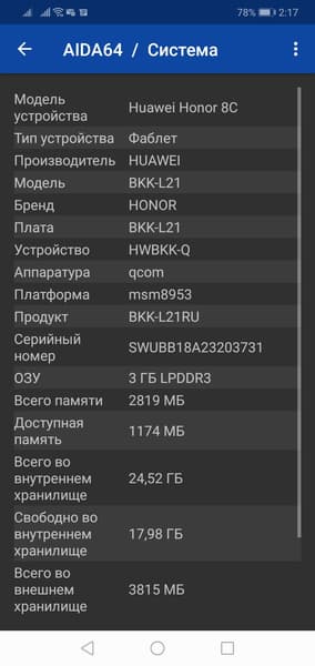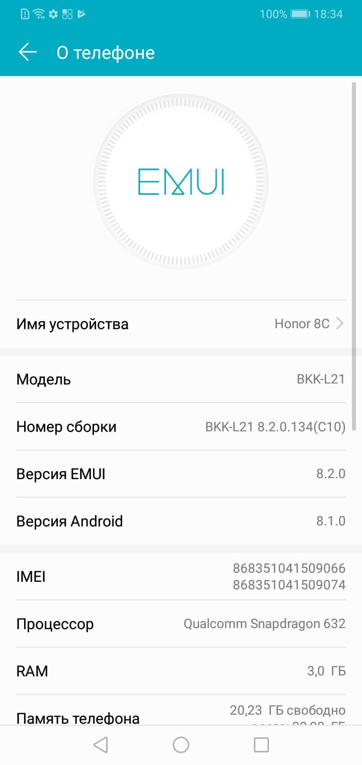 Основные характеристики Honor 8C (модель BKK-L21)