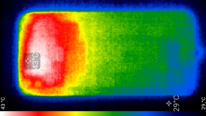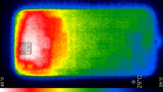 Нагрев локализован в верхней части аппарата, что, видимо, соответствует расположению микросхемы SoC. По данным теплокамеры, максимальный нагрев составил 43 градуса (при температуре окружающего воздуха в 24 градуса), это несколько выше среднего значения в данном тесте для современных смартфонов.