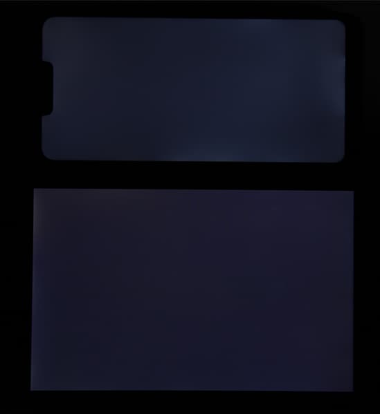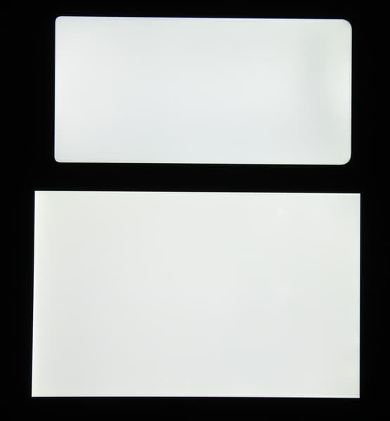 Яркость под углом у экранов уменьшилась (как минимум в 5 раз, исходя из разницы в выдержке) и уменьшилась примерно одинаково. Черное поле при отклонении по диагонали высветляется сильно и приобретает чуть красноватый оттенок. Фотографии ниже это демонстрируют (яркость белых участков в перпендикулярном плоскости экранов направлении одинаковая!):