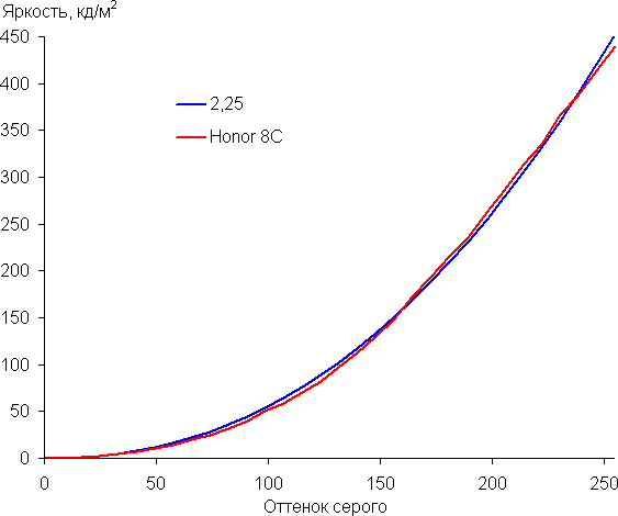 Но на самом деле черное поле воспринимается достаточно равномерным из-за высокой контрастности, которая достигает порядка 1900:1. (На фотографии выше для наглядности яркость подсветки у Honor 8C выведена на максимум.) Время отклика при переходе черный-белый-черный равно 24 мс (13 мс вкл. + 11 мс выкл.). Переход между полутонами серого 25% и 75% (по численному значению цвета) и обратно в сумме занимает 43 мс. Построенная по 32 точкам с равным интервалом по численному значению оттенка серого гамма-кривая не выявила завала ни в светах, ни в тенях. Показатель аппроксимирующей степенной функции равен 2,25, что немного выше стандартного значения 2,2. При этом реальная гамма-кривая слегка отклоняется от степенной зависимости: