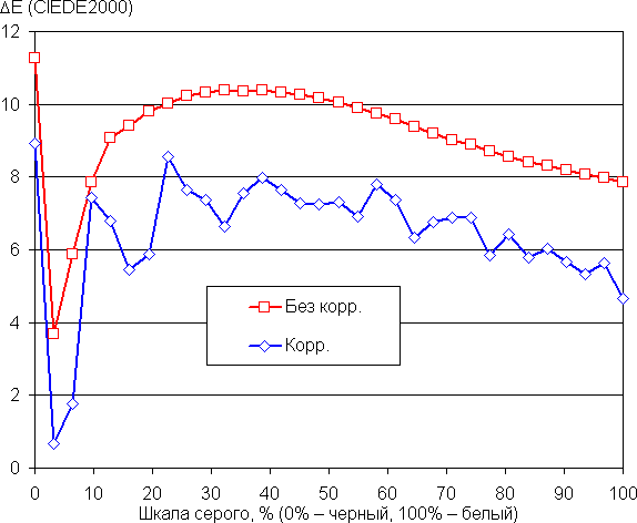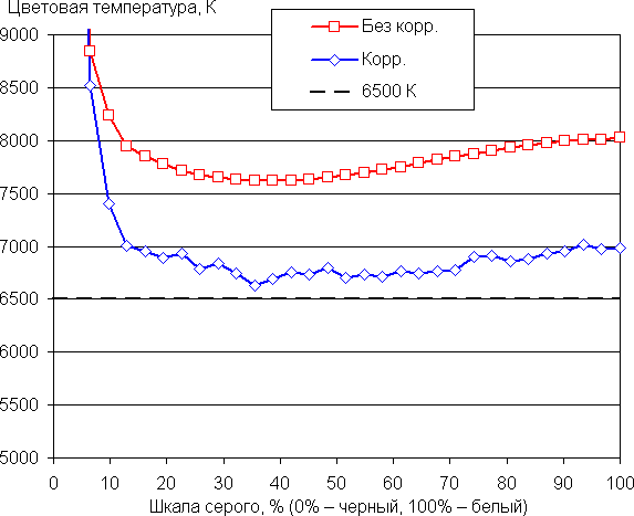 В итоге визуально цвета на этом экране не отличались бы от естественных, но результат слегка портит небольшое завышение цветового контраста. Баланс оттенков на шкале серого компромиссный, так как цветовая температура существенно выше стандартных 6500 К, но отклонение от спектра абсолютно черного тела (ΔE) на части шкалы серого лишь слегка превышает 10 единиц, что для потребительского устройства считается приемлемым показателем. При этом цветовая температура и ΔE мало изменяются от оттенка к оттенку — это положительно сказывается на визуальной оценке цветового баланса. (Самые темные области шкалы серого можно не учитывать, так как там баланс цветов не имеет большого значения, да и погрешность измерений цветовых характеристик на низкой яркости большая.)