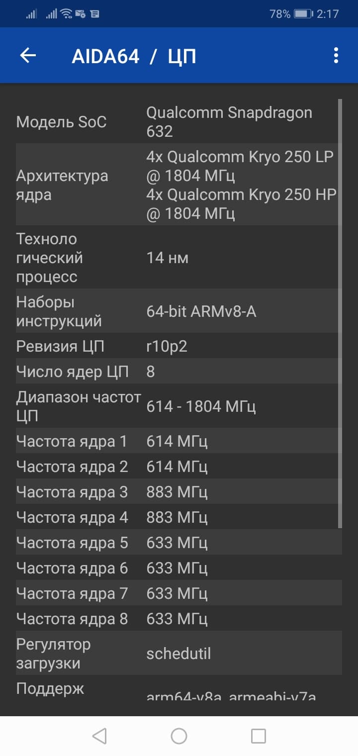 - SoC Qualcomm Snapdragon 632, 8 ядер: 4×Kryo 250 Gold @1,8 ГГц + 4×Kryo 250 Silver @1,8 ГГц