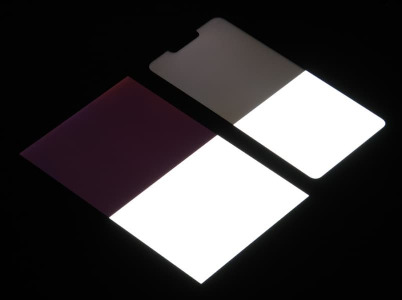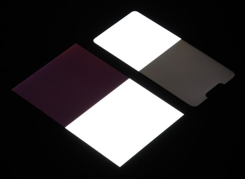 У смартфона к нижнему краю экрана (на фотографии — справа) есть небольшое снижение яркости и изменение цветового тона.