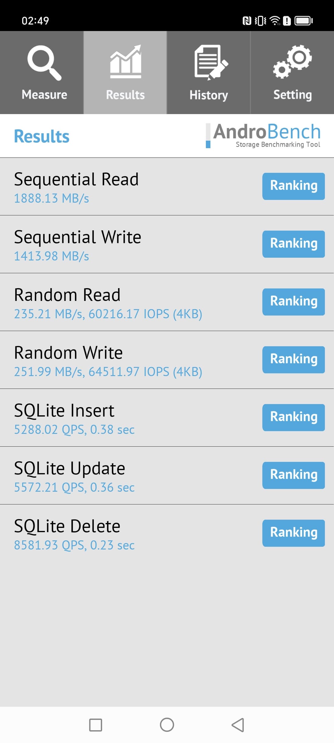 Результаты теста AndroBench на скорость работы с памятью: