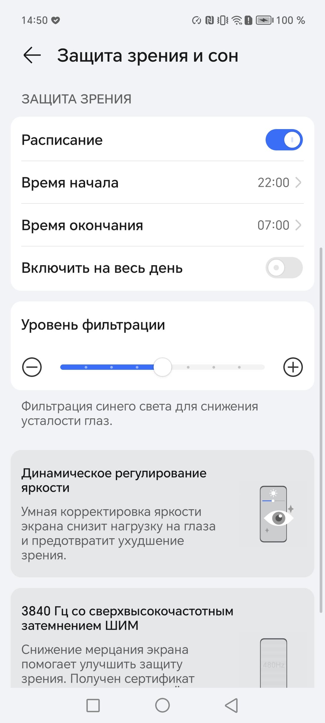 В описании режима Защита зрения приведена дезинформация про усталость глаз. В принципе, яркий свет может приводить к нарушению суточного (циркадного) ритма (см. статью про iPad Pro с дисплеем 9,7 дюйма), но все решается снижением яркости до низкого, но еще комфортного уровня, а искажать цветовой баланс, уменьшая вклад синего, нет абсолютно никакого смысла.