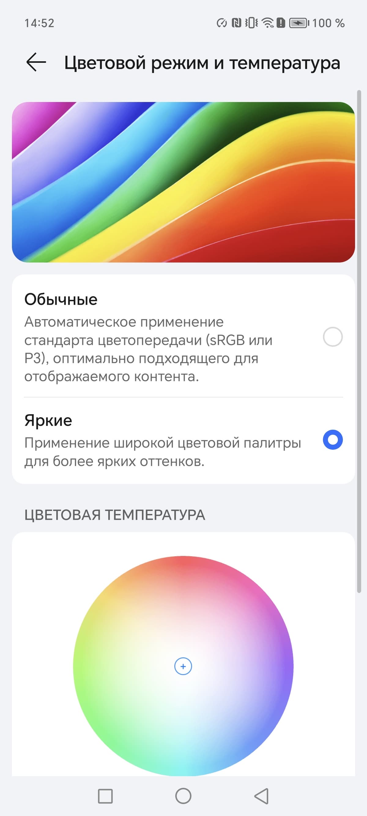 Цветовой охват в случае профиля Яркие немного шире sRGB, а в случае Обычные — близок к sRGB: