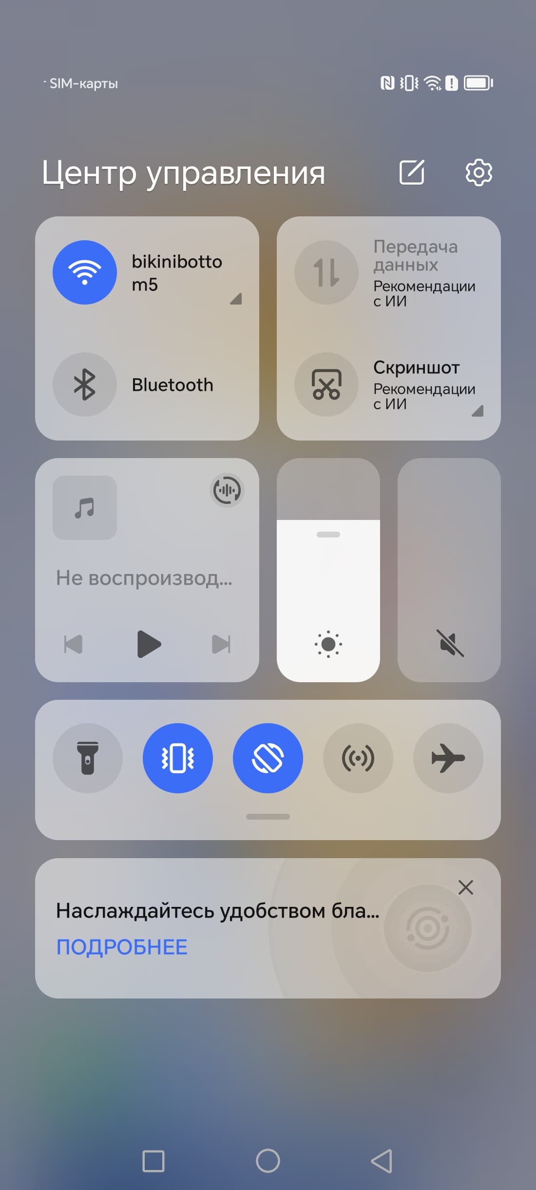 Интерфейс хорошо оптимизированный, работает плавно и быстро. Все необходимые возможности для самостоятельной настройки имеются, можно использовать жесты или вывести для управления три классически кнопки внизу. Шторка разделена на две части в зависимости от места оттягивания.