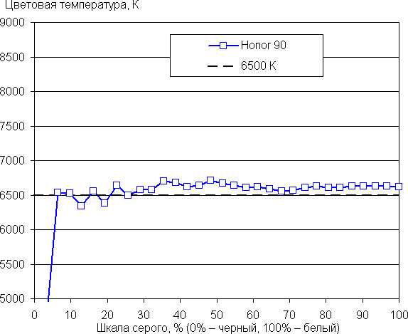 Напомним, что в случае OLED-экранов яркость фрагментов изображения динамично меняется в соответствии с характером выводимого изображения — чуть уменьшается для светлых в целом изображений. В итоге полученная зависимость яркости от оттенка (гамма-кривая), скорее всего, не соответствует гамма-кривой статичного изображения, так как измерения проводились при последовательном выводе оттенков серого почти на весь экран.